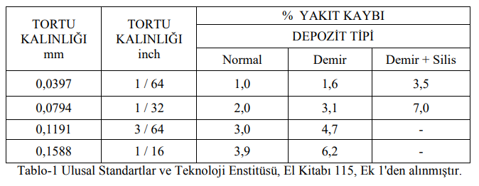 Kazan borularının ısı transfer yüzeylerinde tortu oluşumunun engellenmesi önemli ölçüde enerji tasarrufu sağlar. Kazanlardaki tortular nedeniyle yakıt tüketimi %7'ye kadar artabilir. Tortu kalınlığı ve bileşiminden kaynaklanan enerji kaybı aşağıda verilmiştir. (Tablo 1)