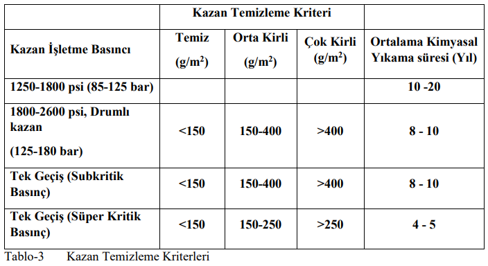 Aşağıdaki tabloda kimyasal yıkamaya karar verilebilmesi için temizlik kriterleri verilmiştir. (Tablo 3)